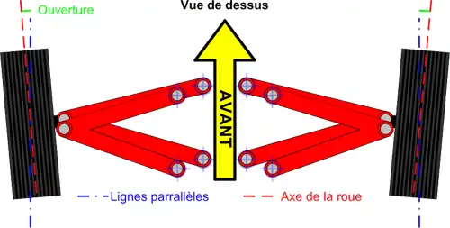 On dit qu'il y a « ouverture » quand les plans de roues tendent à se croiser derrière le train roulant étudié. On mesure cette valeur en degrés et minutes.