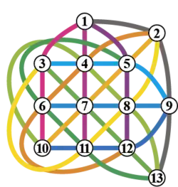 Plus généralement, un plan affine fini d'ordre possède points et droites ; chaque droite contient points, et chaque point appartient à droites ; il existe classes de droites parallèles[1],[2]. Le plan affine d'ordre 3 est appelé configuration de Hesse.