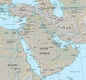 L'usage a consacré les notions de Proche-Orient et de Moyen-Orient, sans qu'il existe une définition unique de leur périmètre géographique. Le plus souvent, le Moyen-Orient désigne la région située entre la rive orientale de la Méditerranée, de l'Égypte à la Turquie, et l'Iran en Asie méridionale et dont le cœur est la péninsule arabique. Cette définition est parfois étendue vers l'Est à l'Afghanistan et au Pakistan, et vers l'Ouest aux pays du Maghreb qui sont fortement liés au Moyen-Orient du point de vue de la géopolitique[3].