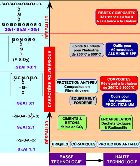 Le rapport Si:Al déterminant la rigidité et la flexibilité du réseau polymérique est ajusté en fonction de l'application visée pour le matériau et des conditions physico-chimiques auxquelles il sera exposé en fonctionnement : ciments géopolymères ou matériaux réfractaires.