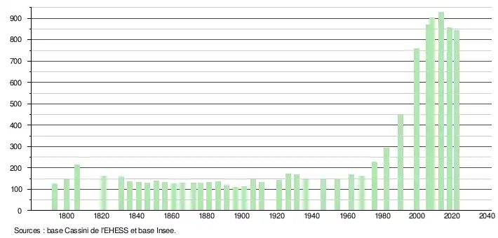 L'évolution du nombre d'habitants est connue à travers les recensements de la population effectués dans la commune depuis 1793. Pour les communes de moins de 10 000 habitants, une enquête de recensement portant sur toute la population est réalisée tous les cinq ans, les populations de référence des années intermédiaires étant quant à elles estimées par interpolation ou extrapolation[15]. Pour la commune, le premier recensement exhaustif entrant dans le cadre du nouveau dispositif a été réalisé en 2008[16].