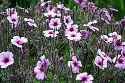 Ses feuilles découpées sont persistantes et il se couvre de petites fleurs roses.