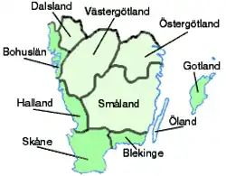 Il comprend les provinces historiques (landskap) : Småland, Öland, Västergötland, Östergötland, Dalsland (en clair sur la carte ci-contre) et depuis le XVIIe siècle Bohuslän, Halland, Scanie (Skåne), Blekinge et Gotland (en sombre sur la carte ci-contre). Au début du Moyen Âge (qui commence en Suède vers l'an 1000), le Värmland et peut-être aussi le Närke, aujourd'hui provinces du Svealand, étaient également considérés comme götalandais.