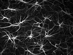 La protéine acide fibrillaire gliale (de l'anglais, Glial fibrillary acidic protein ou GFAP) est un filament intermédiaire présent dans certaines cellules gliales du système nerveux central, les astrocytes notamment. Décrite pour la première fois en 1971, chez l'Homme, le gène codant cette protéine de type III est 17q21[5]. Elle est étroitement liée aux autres protéines du cytosquelette de cellules non épithéliales, à savoir, la vimentine, la desmine ou encore la périphérine. Cette protéine participe au maintien de l'effort cellulaire et à sa forme, ainsi qu'au fonctionnement de la barrière hémato-encéphalique.