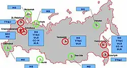 La composante sol du système de positionnement par satellites Glonass comprend des stations qui sont situées sur le territoire de la Russie, hormis quelques stations situées au Brésil et au Nicaragua[21]. Les stations situées sur le territoire russe sont les suivantes[22] :