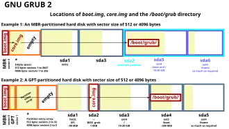 boot.img a la taille de 446 octets et est écrit dans le MBR (secteur 0). core.img est écrit dans les secteurs vides entre le MBR et la première partition, si disponible (pour des raisons historiques la première partition démarre au secteur 63 au lieu du 1, mais ce n'est pas obligatoire). Le répertoire /boot/grub peut être situé sur une partition distincte, ou sur la partition /.