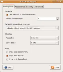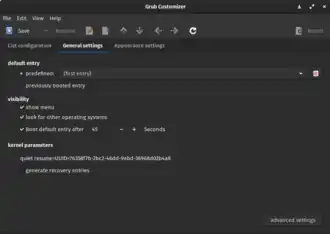 • GRUB peut être utilisé avec différentes interfaces. Beaucoup de distributions GNU/Linux utilisent la prise en charge graphique de GRUB pour afficher au démarrage de l'ordinateur un menu avec une image de fond, et parfois une prise en charge de la souris.