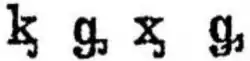 Johan Storm (en) utilise un g barré hameçon palatal, avec la barre à travers la panse, dans la transcription phonétique de Englische Philologie publié en 1892[1].
