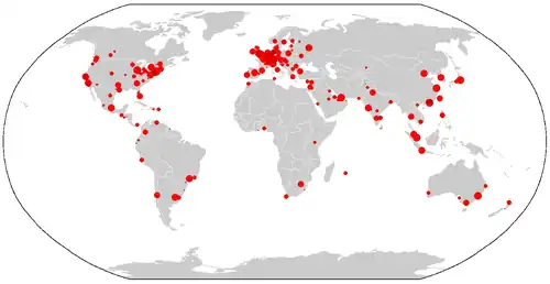 La répartition des villes classées « villes mondiales » dans le monde selon le GaWC