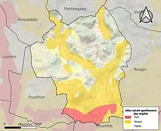 Le retrait-gonflement des sols argileux est susceptible d'engendrer des dommages importants aux bâtiments en cas d’alternance de périodes de sécheresse et de pluie. 50,5 % de la superficie communale est en aléa moyen ou fort (59,3 % au niveau départemental et 48,5 % au niveau national). Sur les 510 bâtiments dénombrés sur la commune en 2019, 442 sont en aléa moyen ou fort, soit 87 %, à comparer aux 85 % au niveau départemental et 54 % au niveau national. Une cartographie de l'exposition du territoire national au retrait gonflement des sols argileux est disponible sur le site du BRGM[15],[Carte 2].