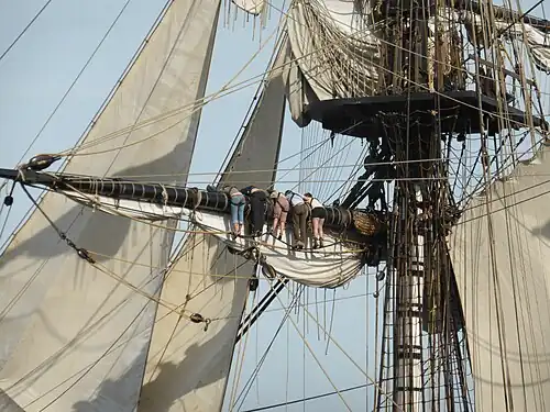 Gabiers ferlant le perroquet du grand-mât de La Grace en 2017 au mouillage dans la baie de Burgsvik (Suède). Les voiles les plus hautes sont les plus difficiles à ouvrir ou fermer, surtout par gros temps ou les mouvements du navire sont amplifiés par la flèche du mat pouvant atteindre jusqu'à 60 m sur les plus gros navires.