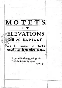 - Motets et élévations de M. Expilly. Pour le quartier de juillet, aoust et . [Paris, Robert III Ballard], 1666, in-4°[8]. Numérisé sur Gallica.