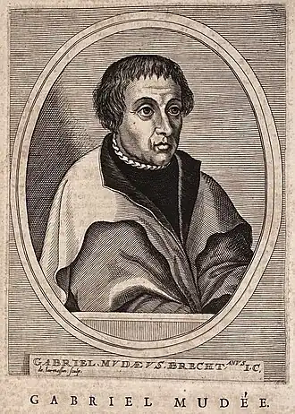 - Fernand de Visscher, « Gabriel Mudaeus » (Discours prononcé à l'occasion du IVe centenaire du doctorat en droit de G. Mudaeus (1539) par son successeur à la chaire de droit romain de l'université de Louvain), Annales de droit et de sciences politiques, 1939 (repris dans Fernand de Visscher, Études de droit romain public et privé, III, Milano, A. Giuffrè, 1966, pp. 433-445).