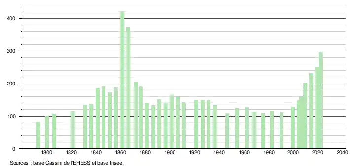 L'évolution du nombre d'habitants est connue à travers les recensements de la population effectués dans la commune depuis 1793. Pour les communes de moins de 10 000 habitants, une enquête de recensement portant sur toute la population est réalisée tous les cinq ans, les populations de référence des années intermédiaires étant quant à elles estimées par interpolation ou extrapolation[20]. Pour la commune, le premier recensement exhaustif entrant dans le cadre du nouveau dispositif a été réalisé en 2004[21].