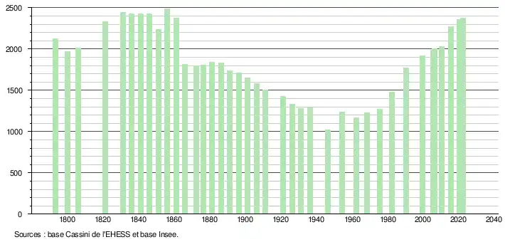| L'évolution du nombre d'habitants est connue à travers les recensements de la population effectués dans la commune depuis 1793. Pour les communes de moins de 10 000 habitants, une enquête de recensement portant sur toute la population est réalisée tous les cinq ans, les populations de référence des années intermédiaires étant quant à elles estimées par interpolation ou extrapolation[24]. Pour la commune, le premier recensement exhaustif entrant dans le cadre du nouveau dispositif a été réalisé en 2005[25]. En 2022, la commune comptait 2 376 habitants[Note 4], en évolution de +3,53 % par rapport à 2016 (Gironde : +6,91 %, France hors Mayotte : +2,11 %). |