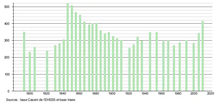 L'évolution du nombre d'habitants est connue à travers les recensements de la population effectués dans la commune depuis 1793. À partir du , les populations légales des communes sont publiées annuellement dans le cadre d'un recensement qui repose désormais sur une collecte d'information annuelle, concernant successivement tous les territoires communaux au cours d'une période de cinq ans. Pour les communes de moins de 10 000 habitants, une enquête de recensement portant sur toute la population est réalisée tous les cinq ans, les populations légales des années intermédiaires étant quant à elles estimées par interpolation ou extrapolation[9]. Pour la commune, le premier recensement exhaustif entrant dans le cadre du nouveau dispositif a été réalisé en 2005[10],[Note 2].