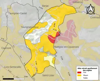 Les mouvements de terrains susceptibles de se produire sur la commune sont soit des chutes de blocs, soit des glissements de terrains, soit des effondrements liés à des cavités souterraines, soit des mouvements liés au retrait-gonflement des argiles. Près de 50 % de la superficie du département est concernée par l'aléa retrait-gonflement des argiles, dont la commune de Gajan[43]. L'inventaire national des cavités souterraines permet par ailleurs de localiser celles situées sur la commune[44].