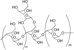 Le galactomannane est un polymère linéaire composé d'une chaîne de monomères de mannose ((1,4)-beta-D-mannopyranose) auxquelles sont ramifiés par un pont 1-6 une unité de galactose.