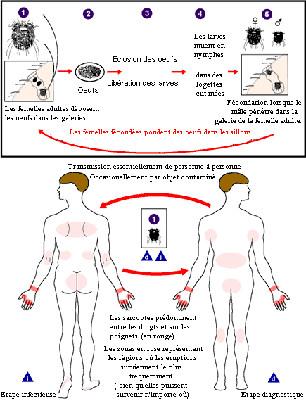 - ↑ Sarcoptes scabiei, variante hominis, guide Efficat, sur http://www.inrs.fr. « Survie à l'extérieur de l'hôte : Sarcopte adulte = 24 à 48 h ; Larves < ou = 5 jours ; Œufs = 10 jours ».