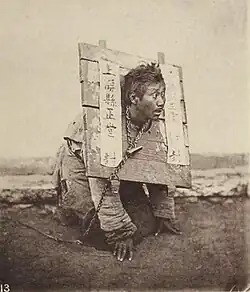 "...ils lui ont jeté les fers aux pieds et aux mains et après cela une planche autour du cou. ... Sur cette planche qui tombe vers l'avant, sa condamnation est écrite en grosses lettres... Et c'est ainsi que cette tablette est un grand tourment, parce qu'un homme ne peut ni dormir ni manger, parce que ses mains sont sous la planche avec des menottes aux mains, et qu'il n'y a aucun moyen de vivre."- Quelques choses connues de Chine, Galeote Pereira.