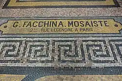 Les mosaïques du sol, avec fond en terrazzo, sont signées Giandomenico Facchina et Mazzioli. Leur sobriété soulignée par la répétition de formes géométriques simples n'est pas sans rappeler le style des mosaïques de la rue de Rivoli. La grande galerie de 42 m de long est suivie d'une rotonde vitrée avec une coupole en verre hémisphérique, l'ensemble étant d'origine.