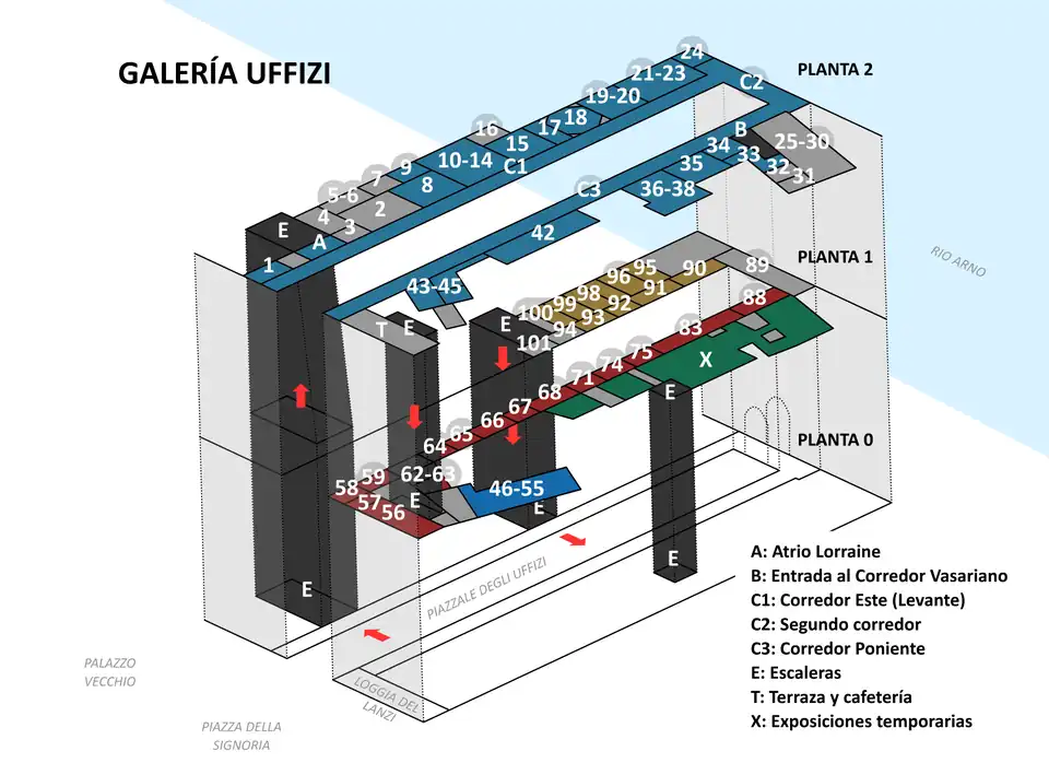 - ↑ Voir le plan des salles sur (it) Come muoversi nel museo (site non officiel uffizi.org, consulté le ).