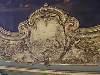 - au-dessus de la porte, le triomphe de Diane Chasseresse, accompagnée de bois de cerfs taillés dans un seul morceau de corne ;
