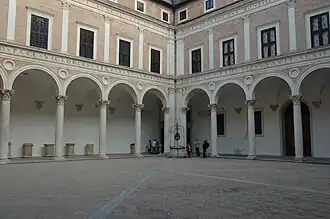 Une inscription dédicatoire est gravée tout au long des deux linteaux sur les quatre côtés de la cour : « FEDERICUS DUX MONTISFERETRI AC DURANTIS COMES SANCTAE RO[MANAE] ECCLESIAR CONFALORERIUS ATQUE ITALICAE CANFEDERATIONIS IMPERATOR HANC DOMUM A FUNDAMENTIS ERECTAM GLORIAE ET POSTERITATI SUAE EXAEDIFICAVIT. - QUI BELLO PLURIES DEPUGNAVIT SEXIES SIGNA CONTULIT OCTIES HOSTEM PROFLIGAVIT OMNIUMQUE PRAELIORUM VICTOR DITIONEM AUXIT. EIUSDEM IUSTITIA CLEMENTIA LIBERALITAS ET RELIGIO PACE VICTORIAS EQUARUNT ORNARUNTQUE »[1]. Dans l’angle sud-est se trouve un puits du XVIIe siècle.