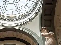 1872 marque un tournant définitif dans l'histoire du musée, lorsqu'il est décidé d'y transférer le David de Michel-Ange, le soustrayant ainsi aux dangers de son emplacement extérieur d'origine sur la Piazza della Signoria. L'architecte Emilio De Fabris est chargé de construire une nouvelle Tribune pour la grande statue, située au fond de la Galerie des Peintures Anciennes, avec son propre éclairage assuré au sommet par une lucarne. En août 1873, la statue est attelée à un chariot en bois complexe et roulée sur des rails à travers les rues du centre de Florence jusqu'à l'Académie, où elle reste cependant enfermée dans son écrin pendant neuf ans, en attendant la fin des travaux de la Tribune[5].