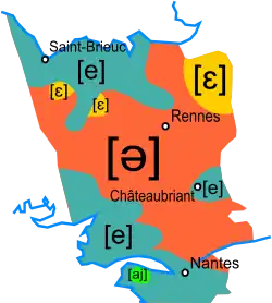 On peut ajouter à ces groupes de nombreuses divisions régionales sur la prononciation. Ainsi, le « ai » de mai correspondant au « oi » français de moi se prononce [a] autour de Rennes, mais [aj] en Loire-Atlantique et [me] ou [ɛ] le long de la frontière avec le breton. Cette répartition n'est pas valable pour tous les mots : ainsi la zone du [ɛ] s'étend vers l'est pour le « ai » de vair (voir), et des mots comme vaizin (voisin) et baire (boire) se prononcent généralement [vejzɛ̃] et [bejʁ], ou [vajzɛ̃] et [bajʁ][16].