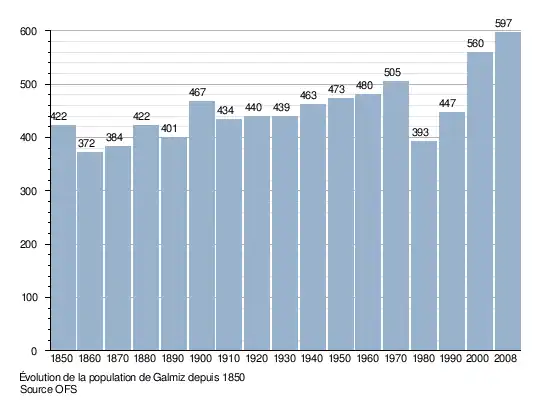 Le graphique suivant résume l'évolution de la population de Galmiz entre 1850 et 2008[3] :