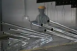- le décapage, qui a pour but d'enlever la calamine et les autres oxydes présents à la surface de l'acier. Le décapage est effectué dans une solution d'acide chlorhydrique dilué à température ambiante, additionné d'un inhibiteur qui permet d'éviter l'attaque de l'acier lorsqu'il est débarrassé de ses oxydes. Des solutions d'acide sulfurique sont parfois utilisées avec l'inconvénient d'une mise en œuvre à 70 °C nécessitant un chauffage. Un décapage mécanique (grenaillage) peut parfois remplacer le décapage chimique, en particulier dans le cas de la fonte, afin d'éliminer la silice se trouvant en surface ;
