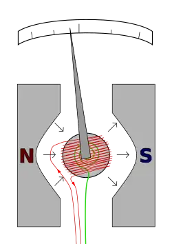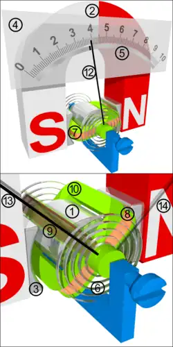 Un galvanomètre à cadre mobile, appelé aussi magnéto électrique, ou mouvement d'Arsonval, est constitué d'une bobine montée sur pivot, baignant dans le champ magnétique d'un aimant fixe, sur cette bobine est fixée l'aiguille de visualisation et 2 ressorts , antagonistes , ou spiral(raux) , chargé(s) de rappeler l'équipage mobile dans la position indiquant le zéro, ainsi que d'alimenter la bobine mobile.