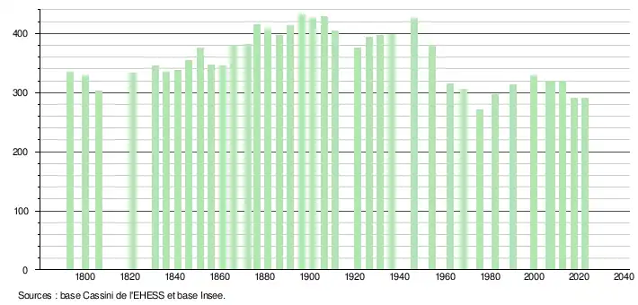 L'évolution du nombre d'habitants est connue à travers les recensements de la population effectués dans la commune depuis 1793. Pour les communes de moins de 10 000 habitants, une enquête de recensement portant sur toute la population est réalisée tous les cinq ans, les populations de référence des années intermédiaires étant quant à elles estimées par interpolation ou extrapolation[21]. Pour la commune, le premier recensement exhaustif entrant dans le cadre du nouveau dispositif a été réalisé en 2007[22].