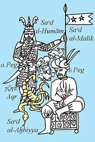 Une variante de Sadachbia est Aoul al Achbiya. L’Égyptien Muḥammad al-Aḫsāsī al-Muwaqqit (XVIIe s.) individualise 3 des 4 étoiles du γζηπ Aqr. 'βγ Aqr est ainsi chez lui آوُل ألأخبية Awwal al-Aḫbiyya, « la premièr [de la Propice] des Caches », qu’Edward Ball Knobel transcrit Aoul al Achbiya et traduit Prima Tabernaculorum[16]. C’est cette transcription qui est passée comme nom sur les catalogues de la toile pour ζ1 Aqr.