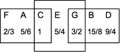 | Quinte | 3/2 = Sol | 9/8 = Ré | 2/1 = Do | 15/8 = Si | 5/4 = Mi |