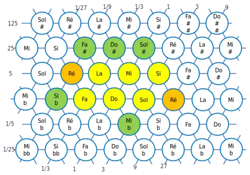 | Quarte | 4/3 = Fa | 2/1 = Do | 16/9 = Si♭ | 5/3 = La | 10/9 = Ré |