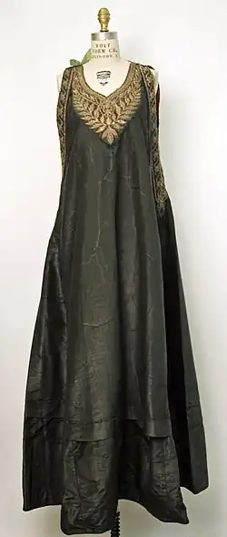 L'encolure est, très souvent en forme de cœur, encadrée d'un long plastron qui descend jusqu'à mi-corps. Les broderies sont plus ou moins importantes dans le bas de la robe[6]. La robe est également garnie d'une ceinture, parfois de velours brodé d'or ou d'argent, ou bien de pièces d'or[6] et se porte avec une chemise aux manches de dentelle ou de tulle brodé[7].