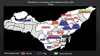 Les deux plus importants gangs rivaux se répartissent dans plusieurs arrondissements de la métropole québécoise, marquant de leur présence rues et boulevards. Saint-Michel et Pierrefonds, par exemple, sont des arrondissements revendiqué par les Crips. Leurs rivaux Bloods défendent, entre autres, les arrondissements Montréal-Nord et Rivière-des-Prairies[3].