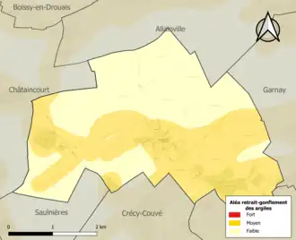 Le retrait-gonflement des sols argileux est susceptible d'engendrer des dommages importants aux bâtiments en cas d’alternance de périodes de sécheresse et de pluie. 50,5 % de la superficie communale est en aléa moyen ou fort (52,8 % au niveau départemental et 48,5 % au niveau national). Sur les 119 bâtiments dénombrés sur la commune en 2019, 119 sont en aléa moyen ou fort, soit 100 %, à comparer aux 70 % au niveau départemental et 54 % au niveau national. Une cartographie de l'exposition du territoire national au retrait gonflement des sols argileux est disponible sur le site du BRGM[17],[Carte 2].