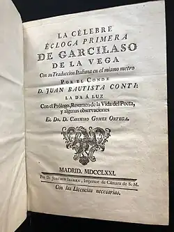 Garcilaso de la Vega était l'ami et le disciple de Juan Boscán. Il imite ainsi Pétrarque et Virgile et introduit en Espagne le goût italien. On lui doit trente-huit sonnets, deux élégies, une épître, trois églogues et cinq chansons. Ses œuvres ont été publiées à Venise (1553) et à Madrid (1765 et 1788)[2].