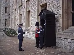 Si quelqu'un se trouve devant une sentinelle pendant qu'elle marche, elle criera : « Faites place à la Garde de la Reine ! (ou garde du château / garde de la tour de Londres / garde du château de Windsor, etc.)[25].