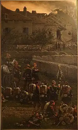 Bataille de Solférino, : Napoléon III ordonne au maréchal Regnaud d'engager le combat avec la Garde impériale. Détachement de grenadiers de la garde impériale, détail d'une peinture réalisée en 1870 par Édouard Detaille. Général Bourbaki, commandant de la garde impériale en 1870.