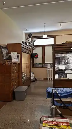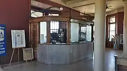 A l'intérieur, la cage à billets dans le hall est d'origine pour le GT, mais ce n'est pas la cage de billets d'origine pour la gare. On ne sait pas quand l'original a été remplacé ; des marques au plancher montrent qu'une cage beaucoup plus grande occupait cet espace[3].