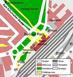 D'importants travaux de construction débutent dans la zone autour de la nouvelle gare principale. L'objectif principal est la réalisation de la continuation du Wilhelminischer Ring (de), un système routier en forme d'anneau construit au XIXe siècle, Ludwig Winter (de) projette la construction d'une place de gare et de la Bahnhofstraße, qui doit relier la nouvelle gare au centre-ville, distant de près de 2 kilomètres. Dans le cadre de ces mesures, à partir d'août 1958, les maisons de la Heitbergstrasse sont démolies pour faire place au nouveau tracé routier afin de créer une ville adaptée aux voitures. En février 1960, les immeubles résidentiels de la Friedrichsplatz sont démolis. Devant la gare, la Berliner Platz est construite, qui n'est reconstruite que dans les années 1960 et 1970. Dans le cadre du déménagement de la gare centrale, le bureau de poste principal est également déplacé du centre-ville vers la Berliner Platz. En 1970, un passage piétonnier au-dessus de la Berliner Platz est achevé entre la gare principale et l'hôtel Atrium (ouvert le 15 juin 1970, démoli en 1999), et un pub y est construit. Au cours des années suivantes, le quartier de la gare fait de nouveau l'objet de mesures de réaménagement. La première phase est achevée en 1992, la deuxième en juin 2006[1].