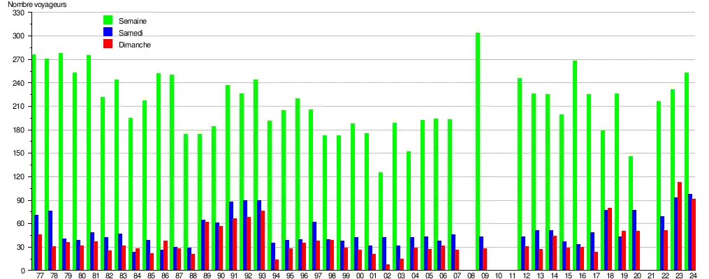 Ce graphique et tableau montre le nombre de voyageurs embarquant en moyenne durant la semaine, le samedi et le dimanche[9].