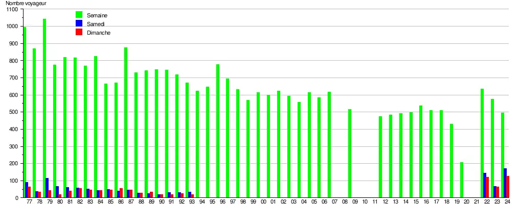 Ce graphique et tableau montre le nombre de voyageurs embarquant en moyenne durant la semaine, le samedi et le dimanche[8].