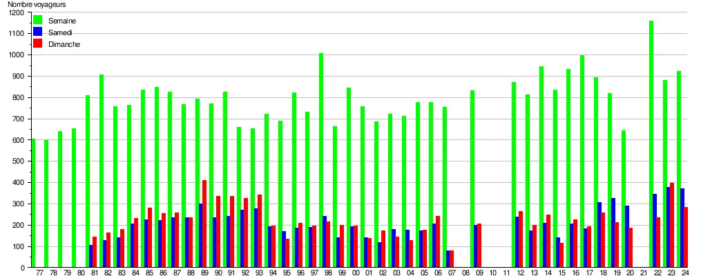 Ce graphique et tableau montre le nombre de voyageurs embarquant en moyenne durant la semaine, le samedi et le dimanche[17].