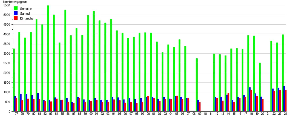 Ce graphique et tableau montre le nombre de voyageurs embarquant en moyenne durant la semaine, le samedi et le dimanche[12].