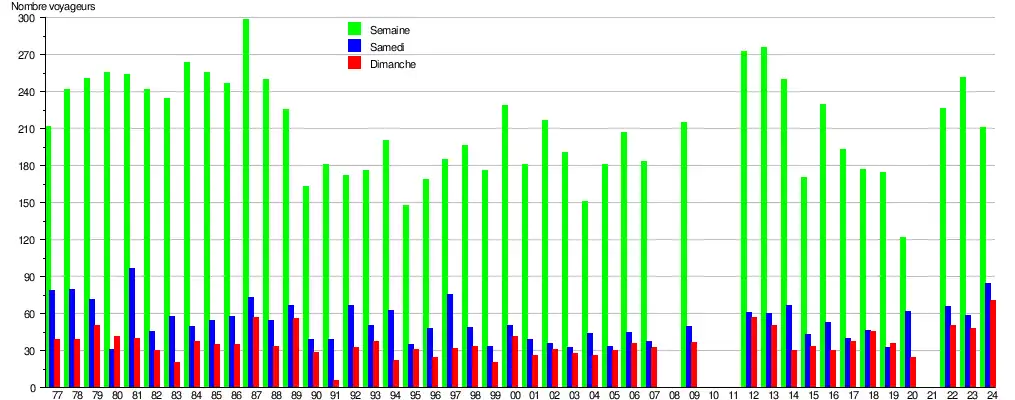 Ce graphique et tableau montre le nombre de voyageurs embarquant en moyenne durant la semaine, le samedi et le dimanche[8].
